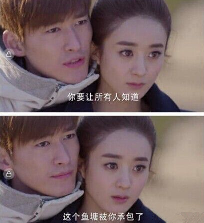; w4 i' P, Z3 _& e- c) T 源自于电视剧《杉杉来了》中,饰演腹黑傲娇总裁的张翰怀抱赵丽颖,说出的一句台词:“我要让全世界知道,这个鱼塘被你承包了”。