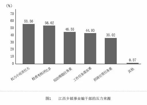 身处一线,压力山大 乡镇虽小,责任重大,是国家政权稳固的基础。“上面千条线、下面一根针”,上级政府的各项工作,最终大部分都要靠乡镇干部去落实。乡镇工作内容涉及经济发展、社会治安、计生维稳、市容卫生、劳动力安置、民政福利等等,其中多项是考核干部时“一票否决”的“硬指标”。随着乡镇发展的提速,群众的利益诉求日益增多且更加多元化,乡镇干部常常处于“五加二”“白加黑”“晴加雨”的高强度工作状态,往往是疲于应付。许多事业编干部反映工作压力很大。通过问卷调查分析,排在乡镇事业编干部工作压力前三位的分别是“权力小而责任大”(占58.56%)、“检查考核评比多”(占56.02%)、“综治维稳任务重”(占46.55%)。此外,“工作任务落实难”(占44.93%)、“招商引资任务重”(占38.02%)也占了相当大的比重。 晋级太难,收入不高 从职务晋升看,由于身份的限制,乡镇事业编干部转为公务员的机会很少,而考进乡镇领导班子的机会更少。一般只有在换届时才有机会通过激烈竞争,晋升到行政编副科级岗位。据统计,2011-2015年,江西全省通过考试进入公务员队伍的事业编干部只有4.13%,得到提拔晋升的只有1.70%。此外,乡镇事业编的副科级管理岗位本身就很少,现有的少量副科级岗位(如维稳信息员)还因设置不规范,面临被清理的尴尬处境。目前,许多乡镇事业编干部到退休也就是股级。为此,有的事业编干部调侃自己,“抬头就是天花板,一眼就能看到退休”。 当前,机关事业单位的工资收入与职务、职称高度相关,晋级难直接影响到工作人员的收入。许多事业编干部临近退休还领着股级的工资。相比同龄的行政编干部,事业编干部不仅职务低,而且收入也低。由于职称评聘条件受名额、岗位、因素限制,再加上乡镇事业编干部队伍的人才结构、职级、工作内容与职称评定的条件存在严重背离,事业编干部通过职称来提高收入待遇的非常少,从而增加了滋生腐败的隐患。 岗位固化,交流不畅 多数乡镇事业编干部不仅提拔无望,而且受编制、因素的影响,能交流到县直事业单位、身份、工作条件、县城周边乡镇工作的机会也较少。许多乡镇事业编干部长期在同一个单位、同一个部门从事相同的工作,一干就是5年、10年,甚至20年以上,工作热情极易出现匮乏。据统计,2011-2015年,江西全省乡镇事业编干部交流到县以上事业单位的比重只有3.84%。为此,有的事业编干部戏称自己是“一个岗位干到头,一个乡镇到退休”。 横向对比,心有失落 由于乡镇工作多而杂,对专业要求不是很高,再加上乡镇人才结构不合理,导致乡镇干部“混编混岗”现象普遍。在与行政编干部的对比中,许多事业编干部极易产生心理落差。有的事业编干部诉苦说:“跟公务员做的事,那完全是一样的,但提拔的机会就不一样。”例如,有的地方党政办主任(事业编干部)一直无法挪动,但手下公务员却一直在通过考试流动,好似“铁打的营盘流水的兵”。对于公务员职务与职级并行的政策,事业编干部普遍存在不满情绪。对于《关于加强乡镇干部队伍建设的若干意见》(中办发〔2014〕14号)和《关于县以下机关建立公务员职务与职级并行制度的意见》(中办发〔2015〕4号)两个文件对江西乡镇事业编干部影响的问卷调查结果显示,32.26%的事业编干部表示对自己影响“非常大”,44.54%的人表示对自己影响“较大”,二者合计达到76.80%。认为“影响不大”的只占17.67%,还有5.53%的人选择了“不了解”。此外,在福利待遇上,还有诸如车改、政策方面的差别。因此,有的事业编干部自嘲“同工不同酬”。 年龄断档,青黄不接 据统计数据,江西全省乡镇事业编干部队伍年龄结构分布情况:35岁以下、35-50岁之间和50岁以上的干部分别占29.74%、51.17%和19.09%。从总体上看,35岁以下年轻干部不足1/3,存在后续缺人的潜在风险。在偏远地区的乡镇,这种情况表现得更为明显。通过实地走访了解,调研组发现部分偏远乡镇事业编干部平均年龄超过45岁,其中40岁以上干部占比接近70%,而30-40岁之间的干部只占9%,其余为新转入的大学生村官、“三支一扶”及退伍安置人员等。 不仅如此,由于工作艰苦和发展空间有限等问题,不少乡镇年轻事业编干部还存在“人在曹营心在汉”的现象,工作不专心,总在想方设法脱离乡镇事业编干部岗位。近年来,通过考试、跳槽以及辞职等方式离岗的事业编干部绝大部分都是30岁以下的年轻干部。对于离开乡镇事业编干部岗位后的去向,“考公务员”愿望占比最高,达47.48%,其后依次为“调到县以上事业单位”(34.97%)、“自主创业”(12.12%)、“调到国有企业”(3.36%)以及2.07%的其他。